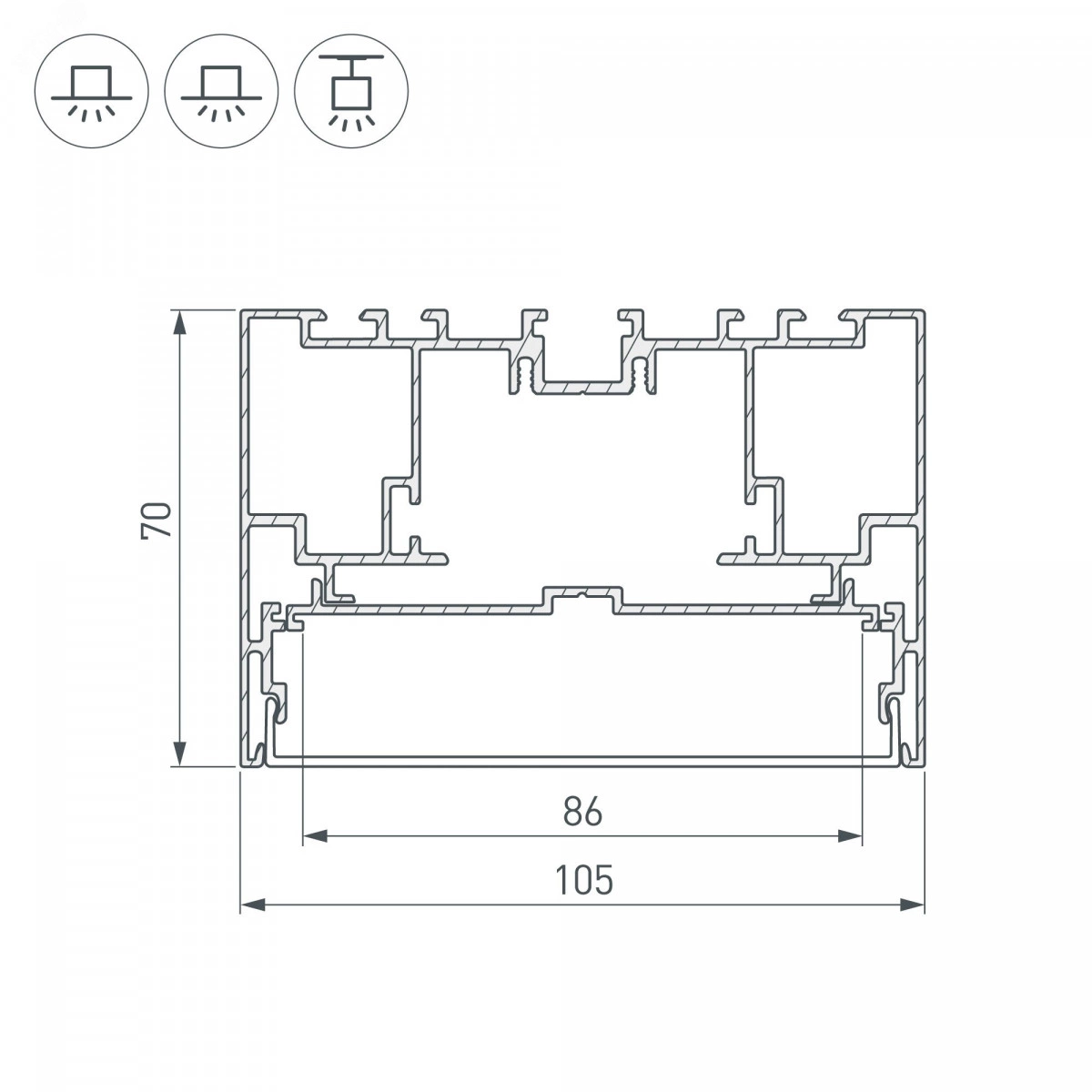 Комплект с экраном. Алюминиевый анодированный профиль для светодиодных лент и линеек. Габаритные размеры (LWH) - 2500x105x70 мм. В комплекте профиль, основание для ленты, PC матовый экран, фиксаторы основания 4шт, винты. Отсек для БП 50х25мм (±1 мм). Ширина площадки для ленты 86 мм. Светопропускание экрана 85%. Аксессуары приобретаются отдельно.