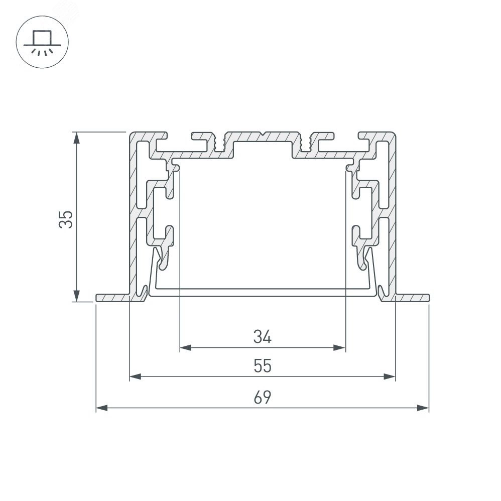 Комплект с экраном. Алюминиевый анодированный профиль для светодиодных лент и линеек. Габаритные размеры (LWH) - 2500x69x35 мм. В комплекте профиль, PC матовый экран. Ширина площадки для ленты 34 мм. Светопропускание экрана 85%. Аксессуары приобретаются отдельно.