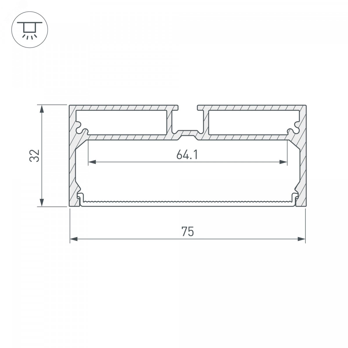 Комплект с экраном. Алюминиевый анодированный профиль для светодиодных лент и линеек. Габаритные размеры (LWH) - 2000x75x32 мм. Ширина площадки для ленты 64 мм. Аксессуары приобретаются отдельно.