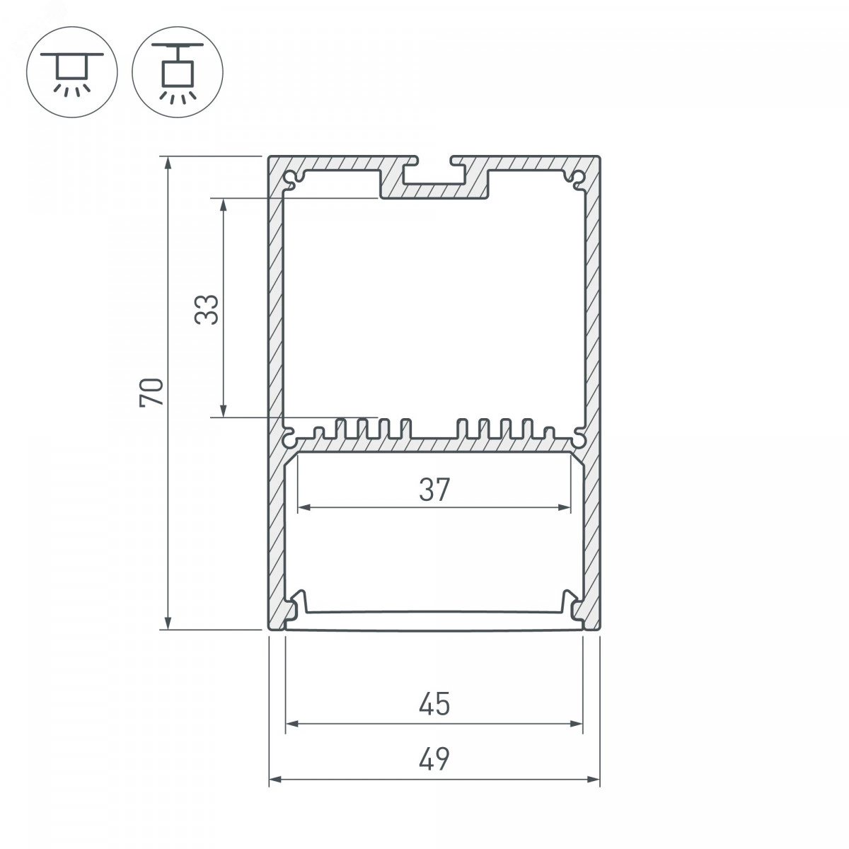 Алюминиевый светотехнический профиль специально предназначен для установки светодиодных лент или линеек. Цвет серебристый. Длина 2500 мм, сечение 49х70 мм. Профиль применяется для создания основного освещения в интерьерах. Монтаж осуществляется накладным либо подвесным способом. Предлагаются дополнительные аксессуары (экраны, заглушки и т.д.), позволяющие создать готовый светильник. Профиль охлаждает светодиодную ленту, продлевая срок её службы и сохраняя яркость, а также защищает от воздействия пыли, влаги и других внешних факторов. Высококачественное анодированное покрытие защищает профиль от внешних воздействий и коррозии. Светотехнический профиль - отличное решение для создания современных световых проектов.