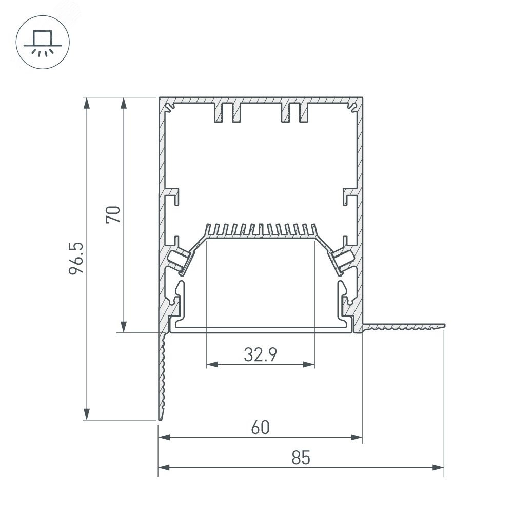 Алюминиевый анодированный профиль для светодиодных лент и линеек, с отсеком для блока питания (размер отсека 48x30 мм). Габаритные размеры (LWH) - 2000x85x96,5 мм. Паз для установки 70х60 мм. Ширина площадки для ленты 32,9 мм. Экраны, заглушки и другие аксессуары приобретаются отдельно.