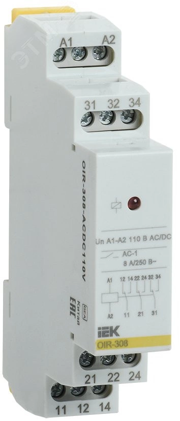 Предназначено для гальванической развязки и передачи команд управления исполнительным элементам, между силовыми цепями и цепями управления. Три контактных группы, с коммутационной возможностью до 8А каждая. Номинальное напряжение катушки реле 110В AC/DC.
