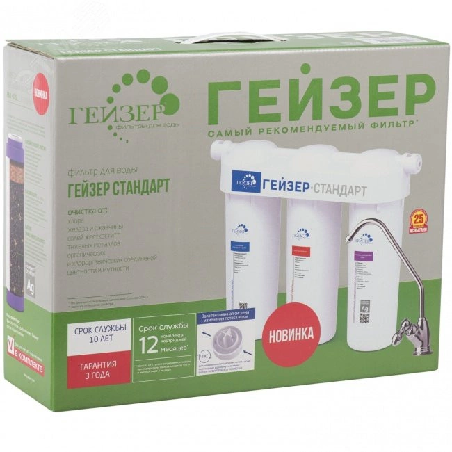Трехступенчатый фильтр Гейзер-Стандарт для жесткой воды специально разработан для регионов с жесткой водой (средний уровень минерализации). Идеальное решение для очистки жесткой воды. Оптимальное сочетание цена — качество. Все необходимое для подключения фильтра Гейзер Стандарт в комплекте. Фильтр Гейзер Стандарт для жесткой воды состоит из 3 картриджей - осадочный картридж PP — удаляет нерастворимые частицы, размером до 5 мкм (ржавчина, взвеси), БС — для удаления солей жесткости, БАФ — универсальный картридж для удаления хлора, органических примесей, железа и тяжелых металлов. Содержит серебро.