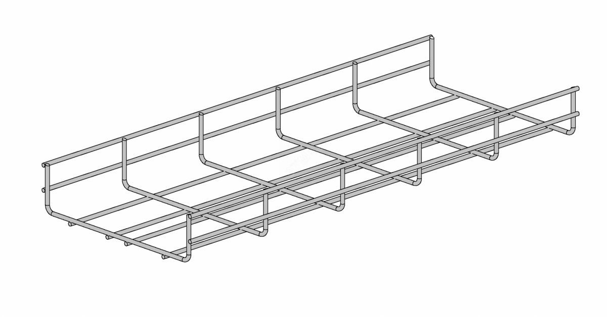 Проволочные лотки высотой 50 мм. Проволочные лотки применяются, в основном, при невысоких нагрузках, в местах с особыми требованиями к вентиляции или санитарии, например в пищевой и фармацевтической промышленности, а также при создании сложных трасс с разными поворотами, ответвлениями и спусками.