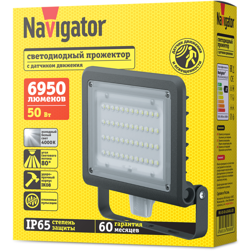 Полное описание: Прожектор светодиодный 80 679 NFL-03-50-4К-BL-LED 50Вт 4000К IP65 6950лм с датчиком черн. Navigator 80679