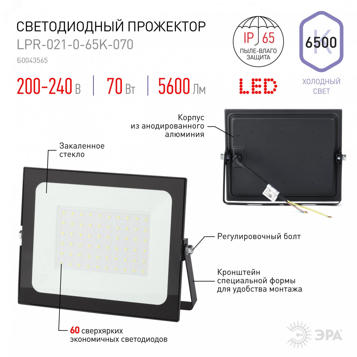 Прожектор светодиодный уличный (СДО) ЭРА LPR-021-0-65K-070 мощность 70 Вт, с цветовой температурой 6500К (холодный белый свет), пылевлагозащитой IP65 (защищен от пыли и струй воды с любого направления), световым потоком 5600 Лм. Корпус изготовлен из анодированного алюминия с покраской в черный цвет. Стекло - закаленное. LED технология обеспечивает длительный срок службы и экономию электроэнергии. Светильник работает в широком диапазоне рабочих напряжений - 200-240В, а также широком диапазоне температур от -40 до +45 - подходит как для внутреннего, так и наружного применения. Предназначен как для промышленного, так и для бытового освещения: дворов, подсобных помещений, приусадебных хозяйств, билбородов, в качестве уличного фонаря.