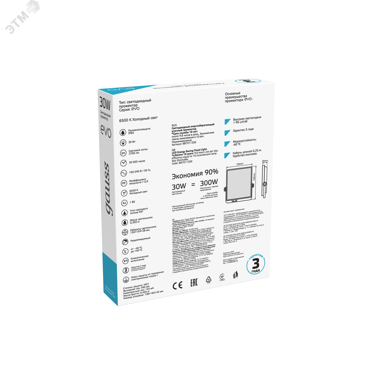 Прожектор светодиодный LED ДО 30 Вт 2700 Лм 6500К IP65 159х134х28 мм EVO Gauss