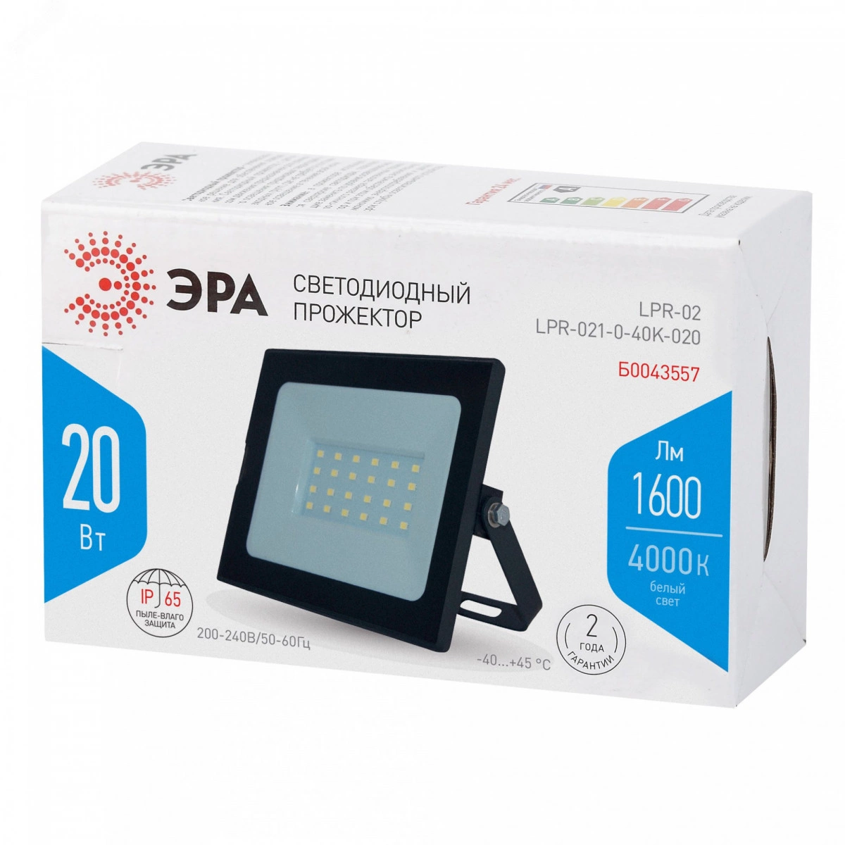 Прожектор светодиодный уличный (СДО) ЭРА LPR-021-0-40K-020 мощность 20 Вт, с цветовой температурой 4000К (нейтральный белый свет), пылевлагозащитой IP65 (защищен от пыли и струй воды с любого направления), световым потоком 1600 Лм. Корпус изготовлен из анодированного алюминия с покраской в черный цвет. Стекло - закаленное. LED технология обеспечивает длительный срок службы и экономию электроэнергии. Светильник работает в широком диапазоне рабочих напряжений - 200-240В, а также широком диапазоне температур от -40 до +45 - подходит как для внутреннего, так и наружного применения. Предназначен как для промышленного, так и для бытового освещения: дворов, подсобных помещений, приусадебных хозяйств, билбородов, в качестве уличного фонаря.