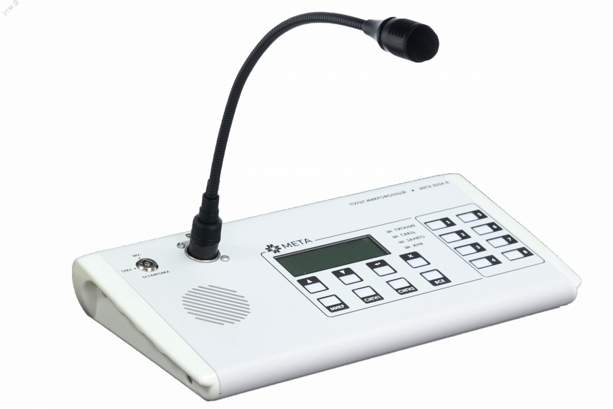 Предназначен для работы с устройствами системы оповещения по сети Ethernet. Питание по PoE или от внешнего источника питания. Возможна двусторонняя связь с другим пультом МЕТА 8554 или абонентским устройством МЕТА 7558 по сети Ethernet. Запись переговоров диспетчера с абонентом. Кнопки прямого доступа свободно программируемы. С помощью одной кнопки можно осуществлять оповещение одной или несколько зон. В случае, если зон больше чем кнопок прямого доступа их вызов осуществляется через меню микрофонного пульта. Во внутреннюю память пульта возможно записать 2 сообщения и запускать их в выбранные зоны с помощью кнопок.