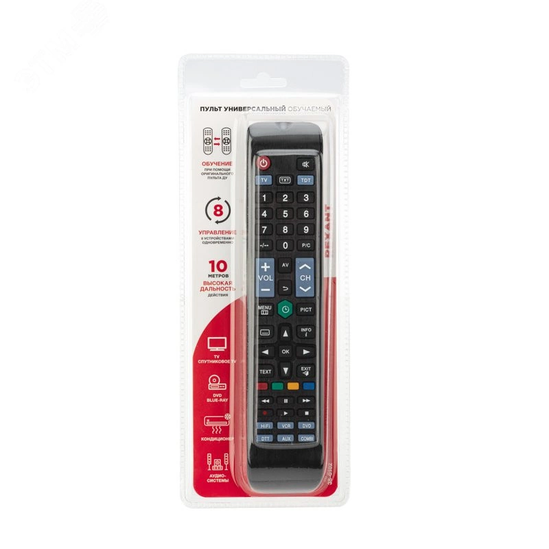 Пульт универсальный на 8 устройств REXANT - приспособление, при помощи которого можно дистанционно управлять сразу несколькими устройствами, например, телевизором, аудиосистемой, приставкой и т. д. Это очень удобно, так как один пульт заменяет несколько, экономит время и избавляет от завалов лишней техники. Подходит для всех телевизоров современных брендов - SAMSUNG, SONY, LG, PHILIPS и др. Пульт поддерживает все необходимые функции, обеспечивающие максимально полное и удобное управление восемью устройствами одновременно. Имеет низкое энергопотребление, удобен и прост в настройке. Благодаря универсальному сочетанию 8 в 1 - вам не придется покупать разные пульты управления для каждого устройства отдельно.