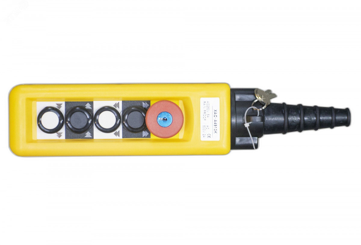 Пульт управления XAC-А4813К 4 кнопки, 1 скорость, авар. стоп + ключ, IP-65 (пост управления кнопочный для тельфера) – является управляющим устройством для грузоподъёмного оборудования, который передаёт электрический сигнал по кабелю, на катушку магнитного пускателя, тем самым коммутирует контакты пускателя, для передачи фазы на двигатель перемещения, либо подъема тельфера.