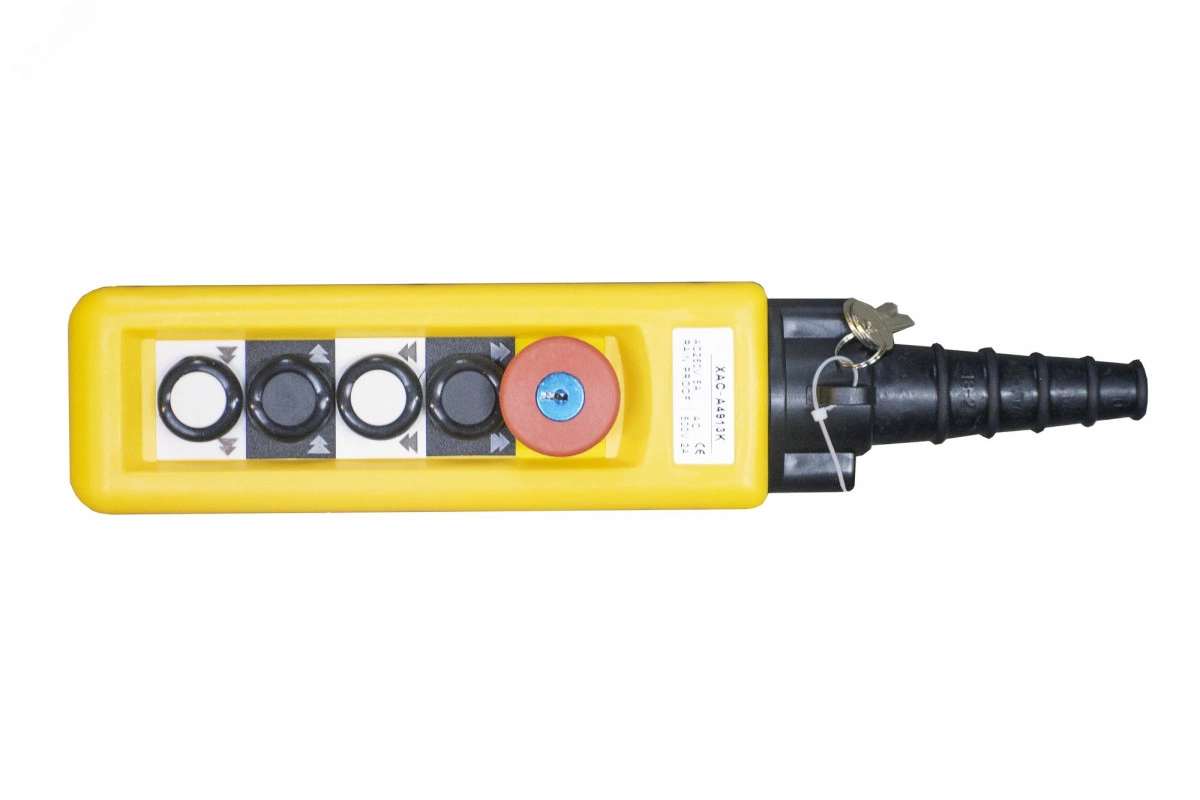 Пульт управления краном XAC-А4913К, 4 кнопок, 2 скор., авар. стоп, ключ (пост управления кнопочный для тельфера) – является управляющим устройством для грузоподъёмного оборудования, который передаёт электрический сигнал по кабелю, на катушку магнитного пускателя, тем самым коммутирует контакты пускателя, для передачи фазы на двигатель перемещения, либо подъема тельфера.