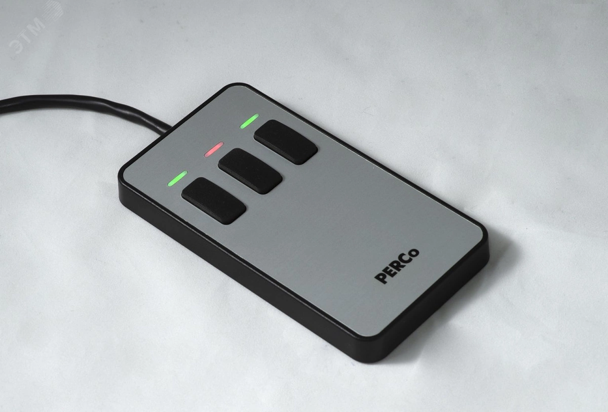 Проводной трехкнопочный пульт дистанционного управления (ПДУ) предназначен для автономного управления ИУ ТМ PERCo. Оператор с помощью ПДУ может подать команду разблокировки ИУ для однократного прохода, установить режим свободного прохода или заблокировать ИУ. Также ПДУ снабжен светодиодной и звуковой индикацией.