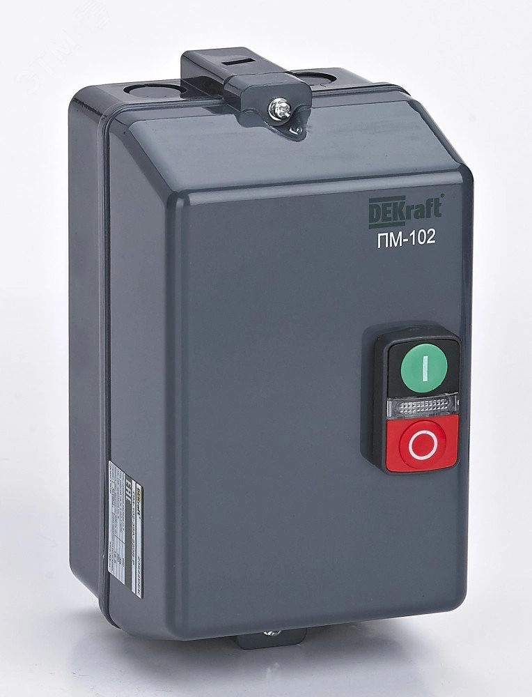 Пускатель электромагнитный серии ПМ-102 DEKraft предназначены для применения в качестве комплектующих изделий в схемах управления электроприводами для дистанционного пуска непосредственным подключением к сети и остановки трехфазных асинхронных электродвигателей с короткозамкнутым ротором, предназначен для коммутации осветительных сетей, нагревательных цепей, первичных цепей трехфазных трансформаторов и других токоприемников при напряжении до 660 В переменного тока частоты 50 и 60 Гц одной из фаз. 3P, номинальный ток 25 А, напряжение управления 380/400 В пер.тока, материал. Корпуса пластик - управление осуществляется кнопками 'Старт' и 'Стоп'