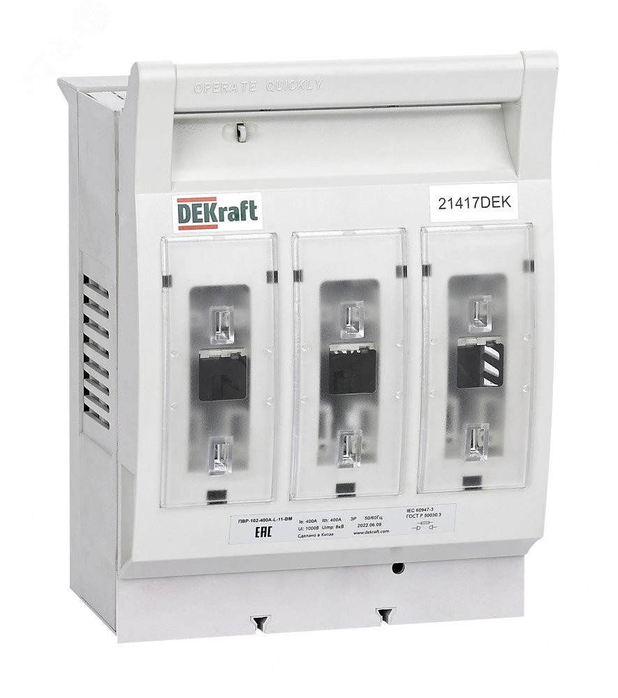 Предохранитель-выключатель-разъединитель горизонтальный (ПВР-102) предназначен для включения и отключения нагрузки с видимым разрывом в сетях трехфазного переменного тока до 400 А частотой 50/60 Гц и номинальным напряжением до 690 В. Трехфазное отключение, навесной монтаж на шины. С дополнительным контактом в комплекте.