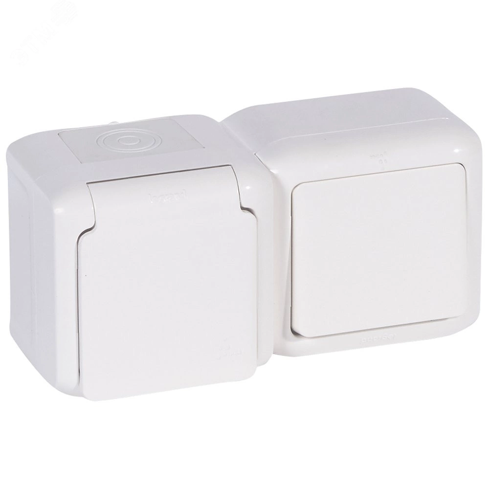 Полное описание: Quteo Блок: Выключатель + розетка с заземлением со шторками наружный белый IP44