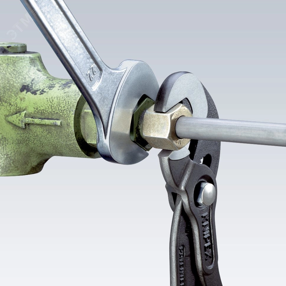 Клещи переставные - гаечный ключ для метрических и дюймовых гаек и винтов под размер 10 - 32 мм (3/8-1 1/4 дюйма). самофиксация на деталях от 17 мм - предотвращается соскальзывание с детали. фиксация инструмента на шестигранных головках метрических или дюймовых винтов - без люфтов, головки винтов не скругляются. надежный и прочный захват скругленных, заржавевших или закрашенных гаек и винтов, идеальны для работы с автомобильными тормозными системами. быстрое закрепление и ослабление винтовых соединений по принципу трещоточного ключа. настройка раствора губок непосредственно на детали одним нажатием кнопки, возможна также одной рукой. настройка непосредственно на детали при одновременно удобном расположений ручек. коробчатый шарнир - высокая стабильность благодаря двум направляющим
