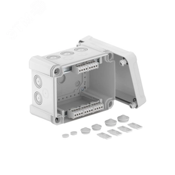 Кабельная распределительная коробка с клеммной колодкой для соединения кабелей и проводов в помещении и вне помещения. Прямоугольная форма со штамповкой под отверстия. Подходит для настенного и потолочного монтажа с возможностью наружного и внутреннего закрепления и монтажа поверх угловых колпаков. Обладает ударопрочностью с IK09. Крышка с быстроразъемным соединением может быть опломбирована. Изготовлено из материалов, не содержащих галогены и обладающих устойчивостью к ультрафиолетовому излучению. В комплект поставки входят - 5 клеммных колодок по 4 клеммы на каждой колодке. Кабельная распределительная коробка согласно DIN EN 60670. Огнестойкость согласно DIN EN 60695-2-11, температура испытания 650 градусовC. Ударопрочность IK09 согласно DIN EN 50102. Класс защиты IP67 согласно DIN EN 60529.