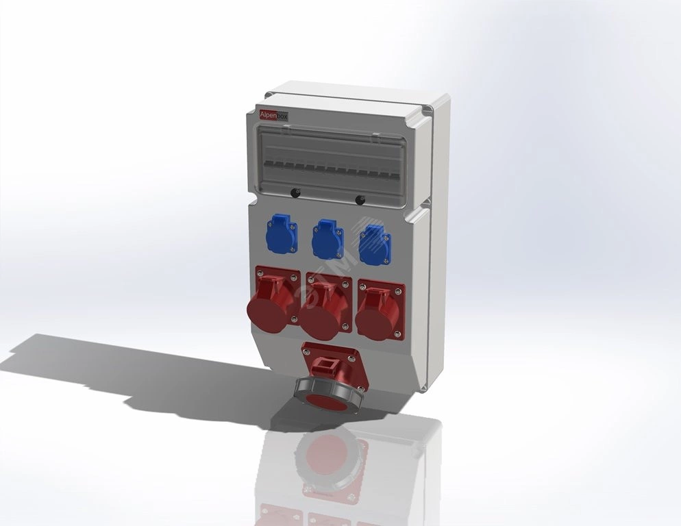 Устройство распределительное AlpenBox, настенное, пластик. На входе сальник - М40, автоматический выключатель 3P 63A. На выходе розетки Schuko - 3, розетки СЕЕ 16А 5р - 1, розетки СЕЕ 32А 5р - 2, розетки СЕЕ 63А 5р - 1. Защита на выходе - автоматический выключатель - 32A/3p - 2шт. 16A/1p - 1шт. 16A/3p - 1шт. Размеры корпуса составляют 297x504x177. Степень защиты изделия IP44