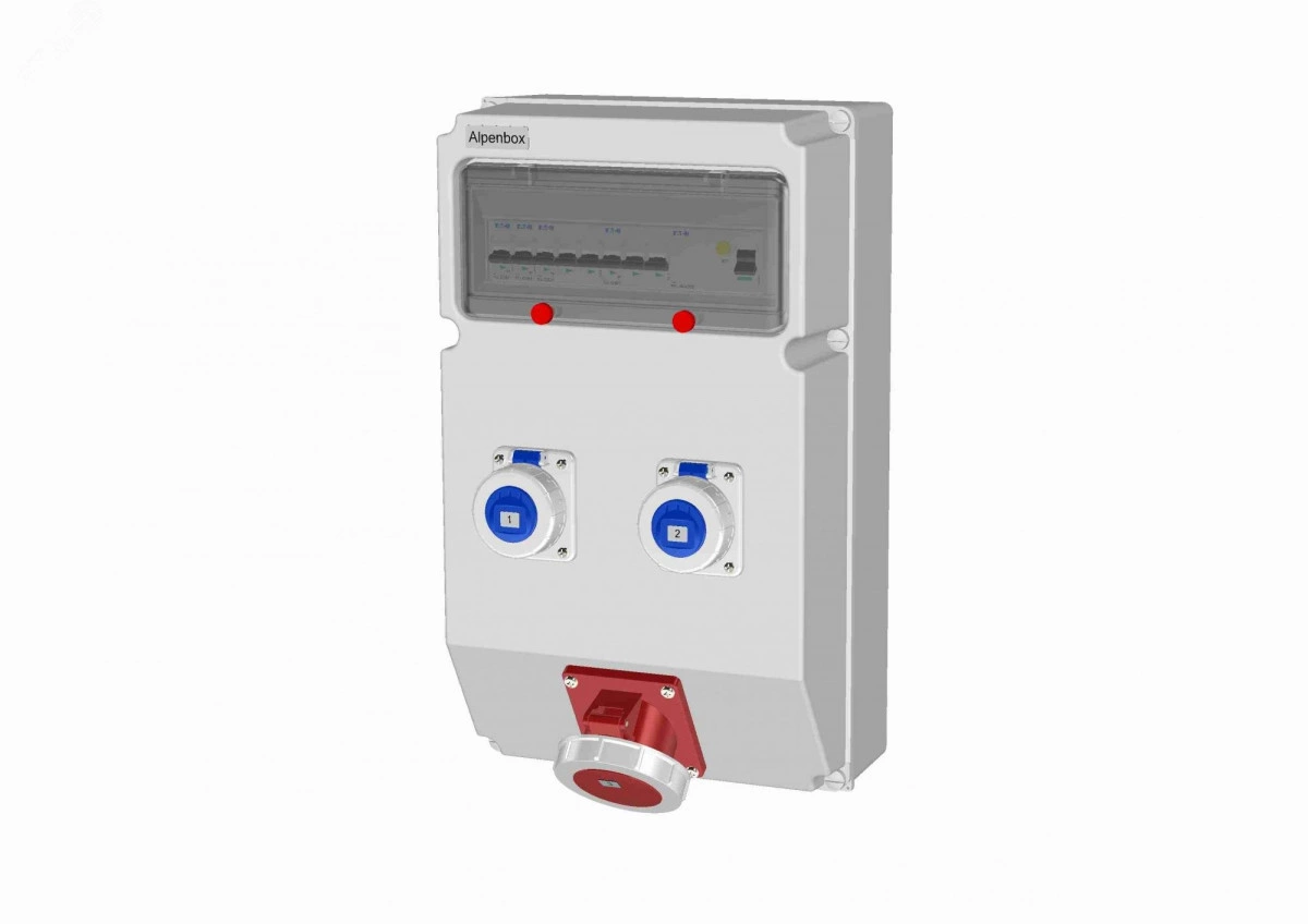 Устройство распределительное AlpenBox, настенное, пластик. Изделие имеет вход сальник - М32, УЗО 4P/40A/30mA+Автоматический выключатель 3P 40A. Выход розетки Schuko - 2, розетки СЕЕ 32А 5р - 1. Защита на выходе - автоматический выключатель - 32A/3p - 1шт. 16A/1p - 2шт. IP 67