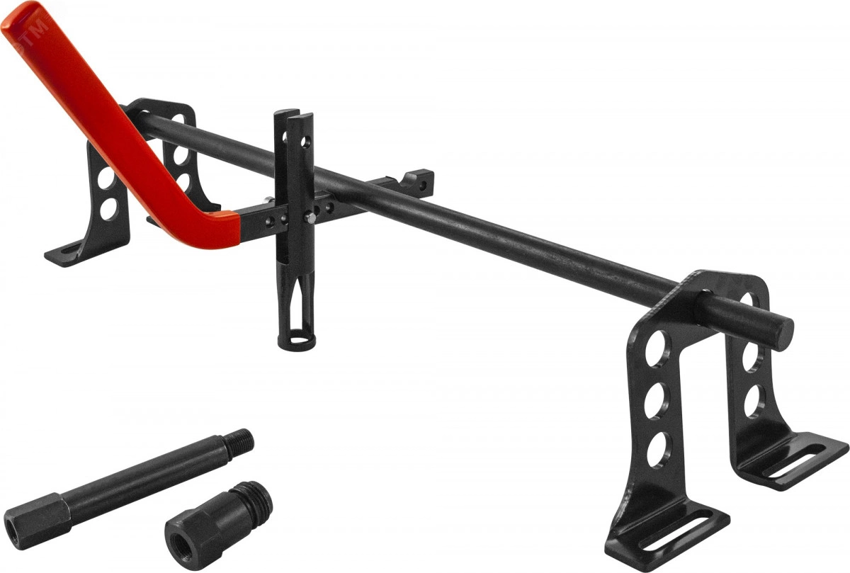Применяется при производстве работ по обслуживанию грм двс без необходимости демонтажа головки блока цилиндров благодаря подаче в камеру сгорания магистрального сжатого воздуха поддерживающего в верхнем положении, тем самым предотвращая возможность падения клапана в цилиндр. Опоры штанги устанавливаются на монтажные элементы гбц, штанга устанавливается в отверстия опор в зависимости от положения обслуживаемого клапана, на г-образном рычаге устанавливается толкатель тарелки пружины клапана. Сжатый воздух подается через свечные отверстия с помощью входящего в комплект шланга и, при необходимости, дополнительного адаптера.