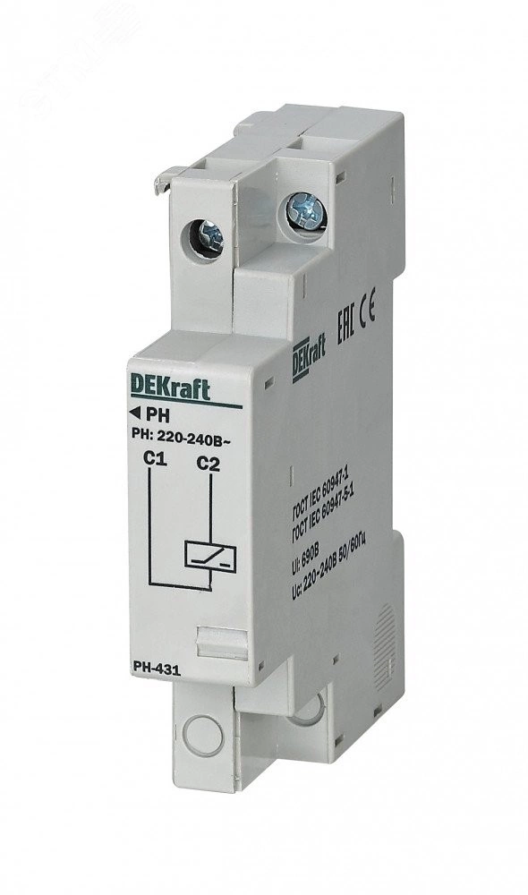 Расцепитель независимый серии РН-431 DEKraft, ном. переменное напряжение 415 В, напр. срабатывания 70-110% от номинального, установка в корпус автоматического выключателя ВА-431 справа. Расцепитель независимый серии РН-431 позволяет дистанционно отключить 3-х полюсный автоматический выключатель серии ВА-431 при подаче на его клеммы номинального напряжения, которое указано на корпусе.