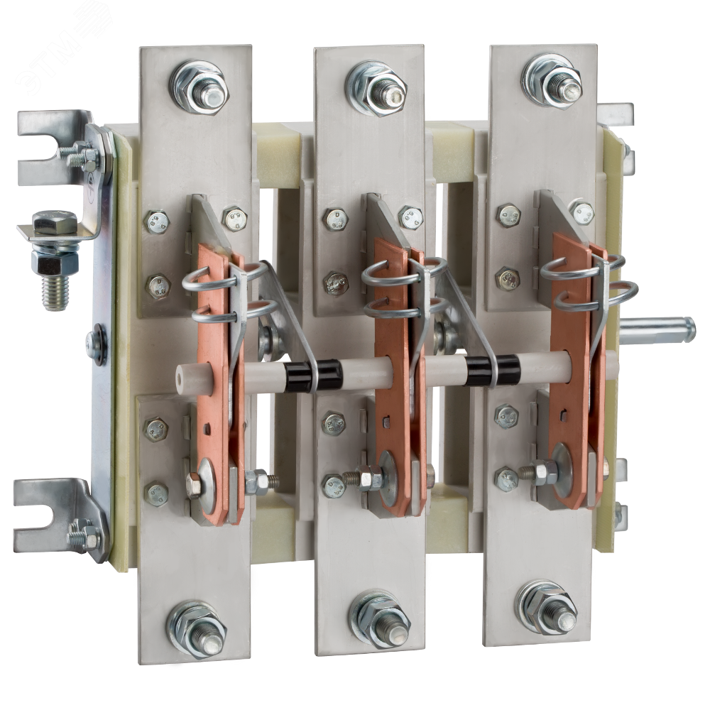 Разъединитель 3 полюсный на номинальный ток 1000 А, где установлена съемная рукоятка, а механическая износостойкость составляет 6300 циклов. Разъединители РЕ19 предназначены для пропускания номинальных токов и нечастых (до трех раз) неавтоматических коммутаций электрических цепей без нагрузки номинальным напряжением до 1000 В переменного тока частоты 50, 60 Гц и номинальным напряжением до 1000 В постоянного тока в устройствах распределения электрической энергии.