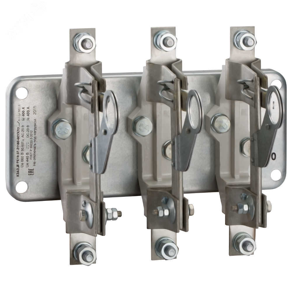 Разъединитель 3 полюсный на номинальный ток 2500 А, где установлена съемная рукоятка, а механическая износостойкость составляет 4000 циклов. Разъединители РЕ19 предназначены для пропускания номинальных токов и нечастых (до трех раз) неавтоматических коммутаций электрических цепей без нагрузки номинальным напряжением до 1000 В переменного тока частоты 50, 60 Гц и номинальным напряжением до 1000 В постоянного тока в устройствах распределения электрической энергии.