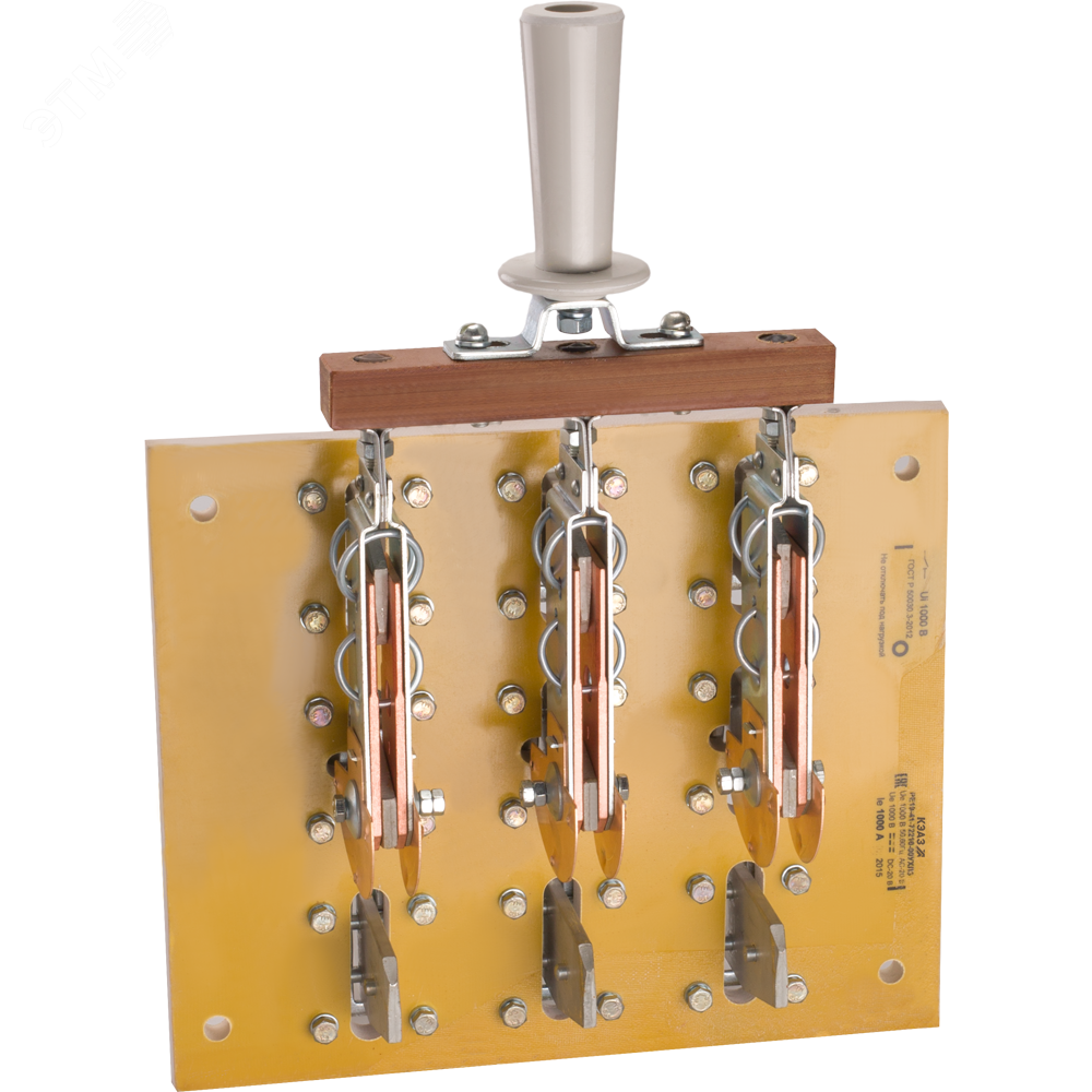 Разъединитель 2 полюсный на номинальный ток 4000 А, где установлена съемная рукоятка, а механическая износостойкость составляет 4000 циклов. Разъединители РЕ19 предназначены для пропускания номинальных токов и нечастых (до трех раз) неавтоматических коммутаций электрических цепей без нагрузки номинальным напряжением до 1000 В переменного тока частоты 50, 60 Гц и номинальным напряжением до 1000 В постоянного тока в устройствах распределения электрической энергии.