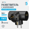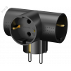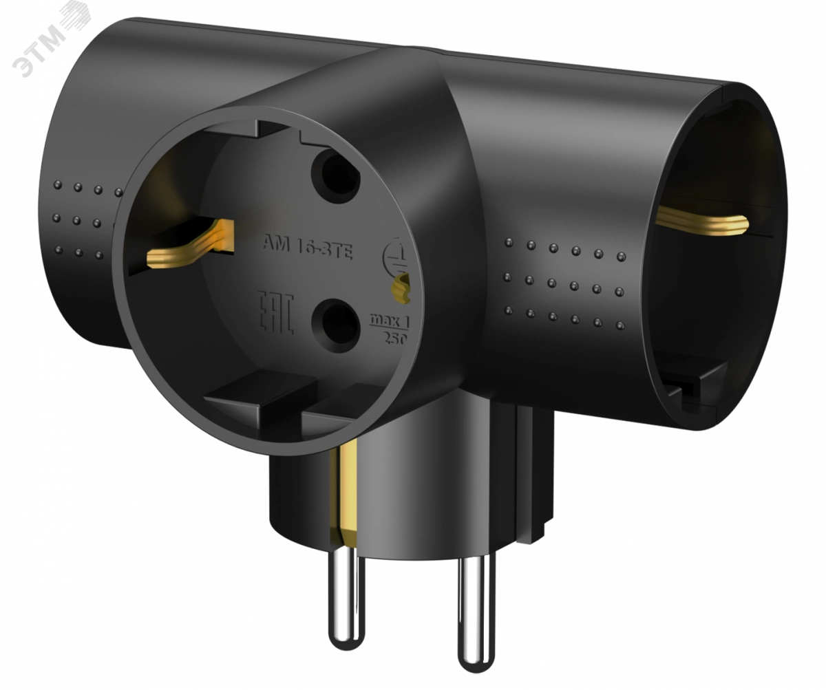 Разветвитель электрический (тройник, Т-обр.) АМ 16-3ТЕ, 16А, с заземлением, черный