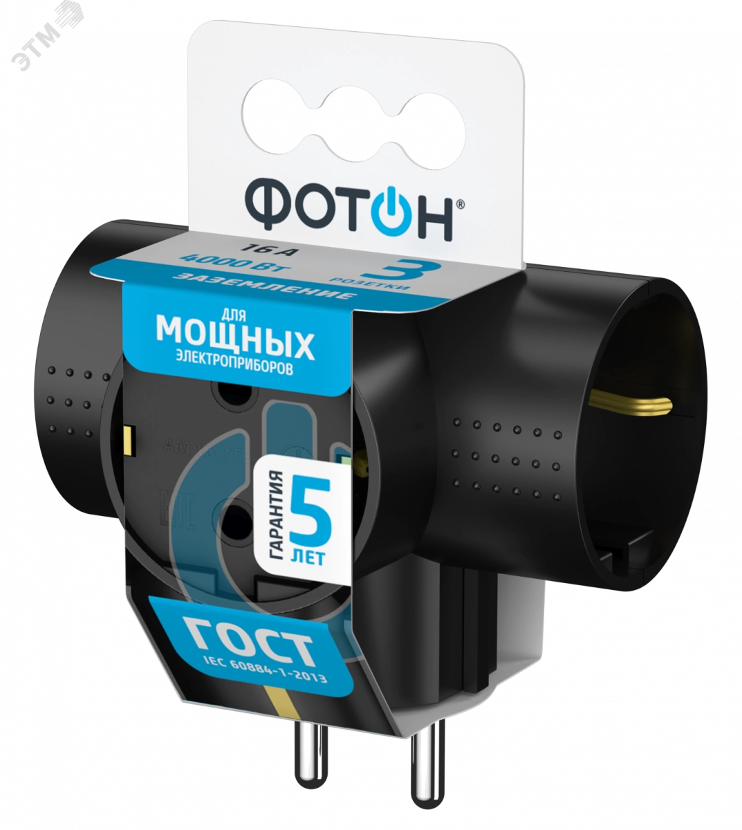 Разветвитель сетевой (тройник, Т-образный) ''ФОТОН'' AM 16-3TE с тремя розетками предназначен для подключения электроприборов суммарной мощностью до 4000Вт. С заземлением. Все разветвители полностью соответствуют нормам ГОСТ и ЕАС, и проходят двойной контроль качества и работоспособности. Предоставляется безусловная гарантия 5 лет.