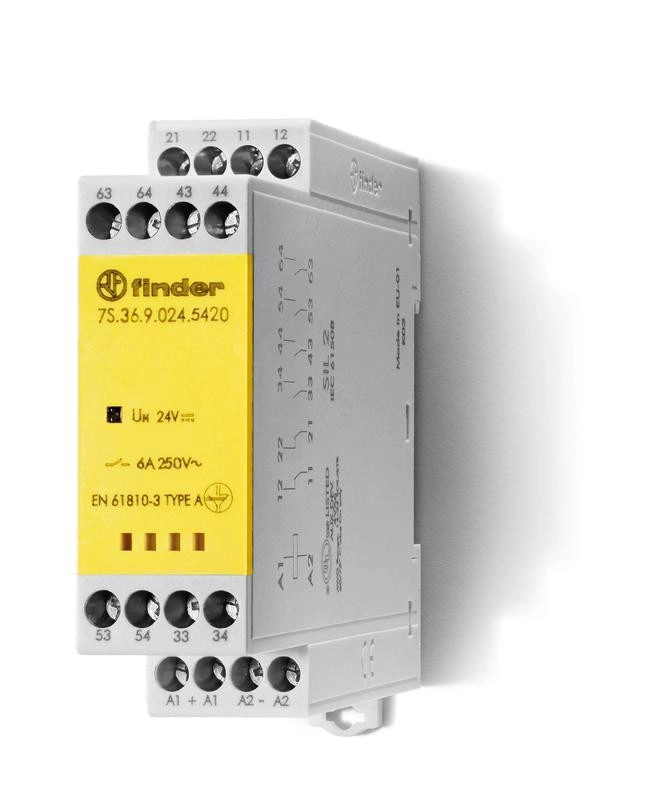 Реле безопасности модульное электромеханич. (реле с принудительным управлением контактами) 4NO+2NC 6А AgNi+Au 24В DC винт. клеммы 22.5мм IP54 FINDER 7S3690245420