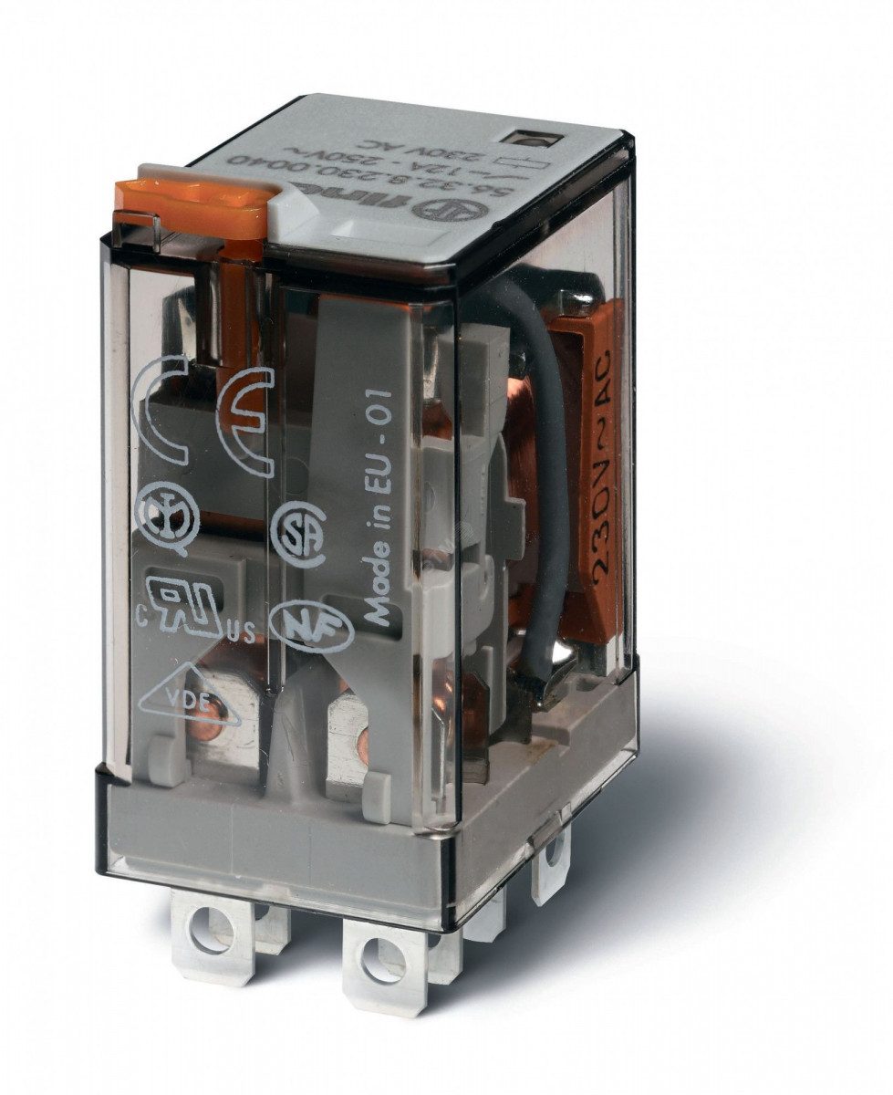 Реле электромеханическое силовое миниатюрное, монтаж в розетку или наконечники Faston (4.8х0.5мм), 2CO 12A, контакты AgNi, катушка 110В DC, степень защиты RTI, опции: кнопка тест + мех.индикатор, упаковка 1шт.