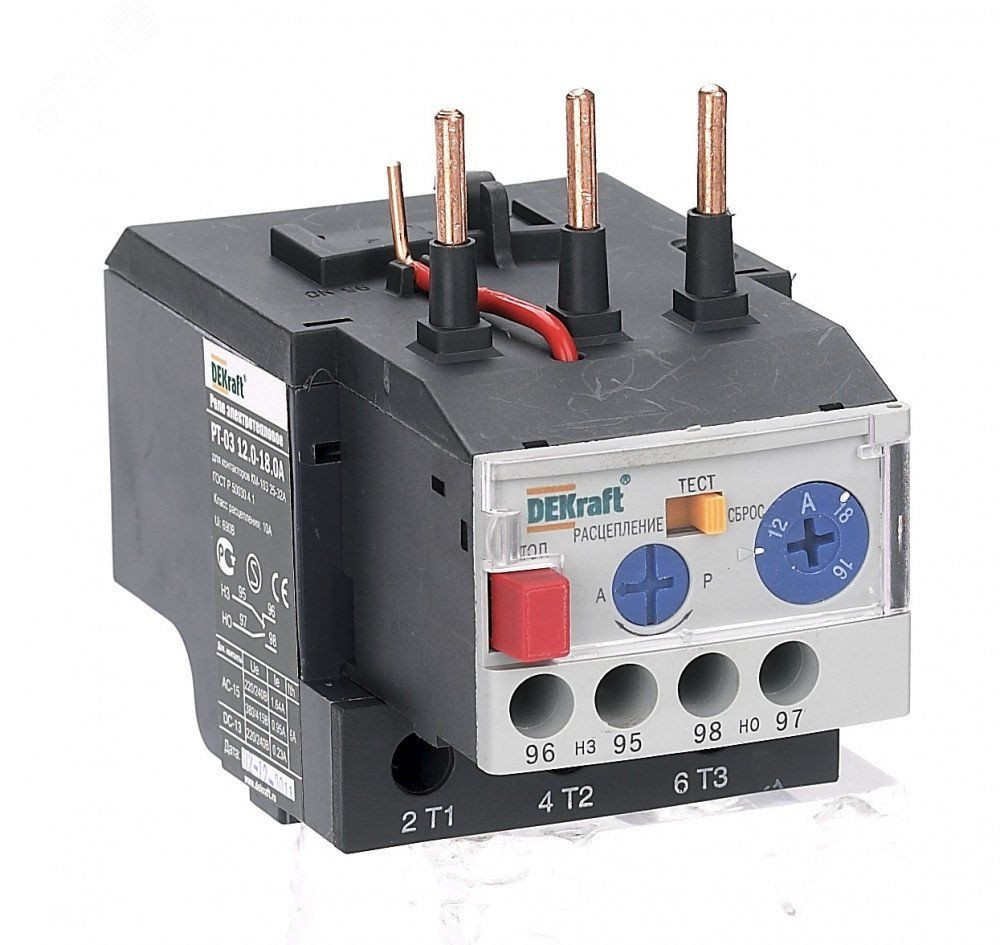 Тепловое реле перегрузки серии РТ-03 DEKraft, предназначено для применения с контакторами КМ-103 на ток 25-32 А, трехполюсное, диапазон уставок реле 6,3-9,0 А, класс расцепления - 10А, два режима повторного включения - ручной и автоматический. Тепловые реле РТ-03 применяются для защиты цепей переменного тока и электродвигателей от перегрузки, асимметрии фаз, затянутого пуска и заклинивания ротора. Реле подходит к соответствующим контакторам других производителей.