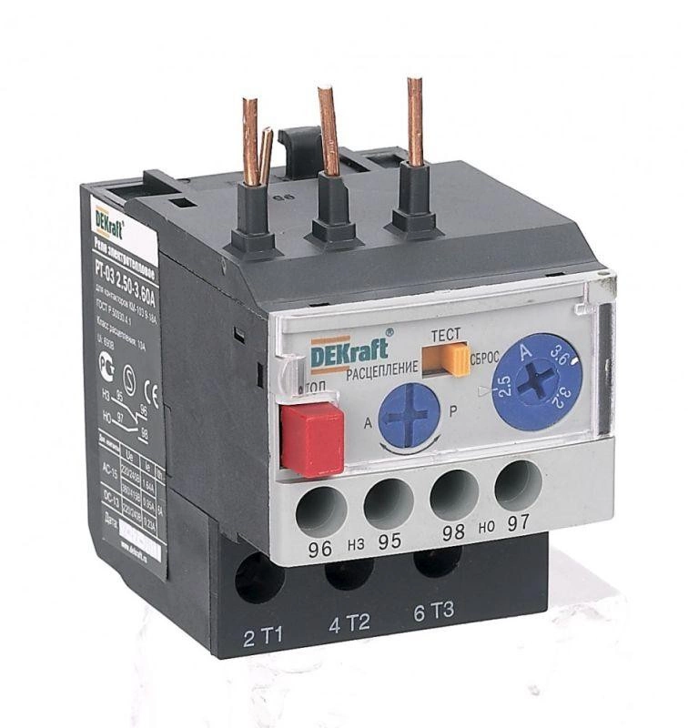 Тепловое реле перегрузки серии РТ-03 DEKraft; предназначено для применения с контакторами КМ-103 на ток 9-18 А; трехполюсное; диапазон уставок реле 1,20-1,80 А; класс расцепления – 10А; два режима повторного включения - ручной и автоматический. Тепловые реле РТ-03 применяются для защиты цепей переменного тока и электродвигателей от перегрузки, асимметрии фаз, затянутого пуска и заклинивания ротора. Реле подходит к соответствующим контакторам других производителей.