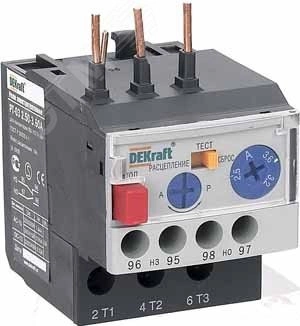 Тепловое реле перегрузки серии РТ-03 DEKraft, предназначено для применения с контакторами КМ-103 на ток 9-18 А, трехполюсное, диапазон уставок реле 0,63-0,90 А, класс расцепления - 10А, два режима повторного включения - ручной и автоматический. Тепловые реле РТ-03 применяются для защиты цепей переменного тока и электродвигателей от перегрузки, асимметрии фаз, затянутого пуска и заклинивания ротора. Реле подходит к соответствующим контакторам других производителей.