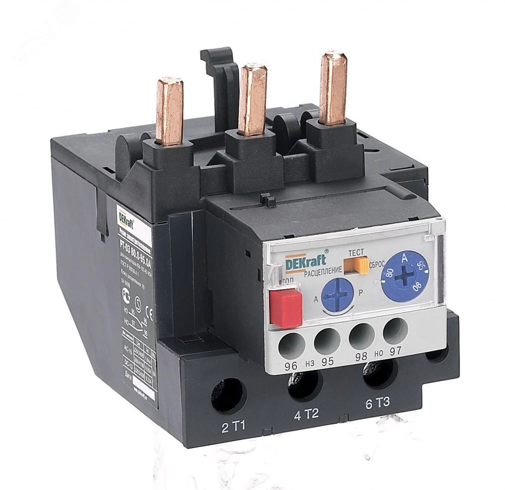 Тепловое реле перегрузки серии РТ-03 DEKraft, предназначено для применения с контакторами КМ-103 на ток 40-95 А, трехполюсное, диапазон уставок реле 18-25 А, класс расцепления - 10А, два режима повторного включения - ручной и автоматический. Тепловые реле РТ-03 применяются для защиты цепей переменного тока и электродвигателей от перегрузки, асимметрии фаз, затянутого пуска и заклинивания ротора. Реле подходит к соответствующим контакторам других производителей.