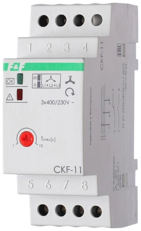 Реле контроля фаз для сетей с изолированной нейтралью CKF-11 (монтаж на DIN-рейке 35мм; регулировка задержки отключения; контроль чередования фаз; 3х400В 8А 1Z 1R IP20)(аналог ЕЛ-11Е) F&F EA04.004.003