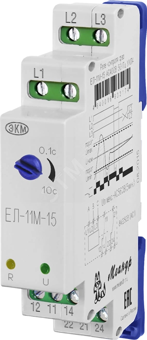 Реле контроля фаз ЕЛ-11М-15 (далее устройство) предназначено для использования в схемах автоматического управления, контроля напряжения в трехпроводных трёхфазных сетях (сетях без нулевого провода), контроля порядка чередования фаз, обрыва и «слипания» фаз, защиты нагрузки от работы на повышенном или пониженном напряжении, а также для контроля асимметрии фаз. Основная область применения - защита источников и преобразователей электрической энергии.