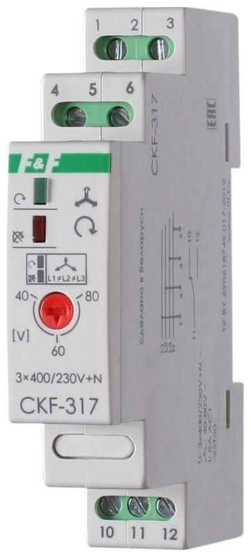 Реле контроля наличия и чередования фаз CKF-317 (монтаж на DIN-рейке 35мм; регулировка порога отключения; 3х400/230+N 8А 1P IP20) F&F EA04.002.006