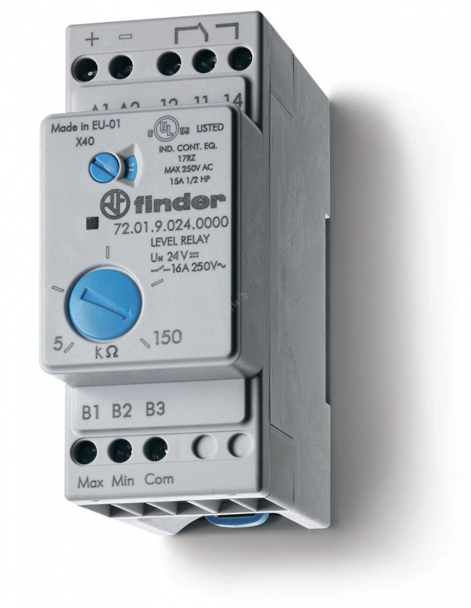 Реле контроля уровня, настраиваемый диапазон чувствительности 5…450кОм, питание 24В AC, выход 1CO 16А, модульное, ширина 35мм, степень защиты IP20