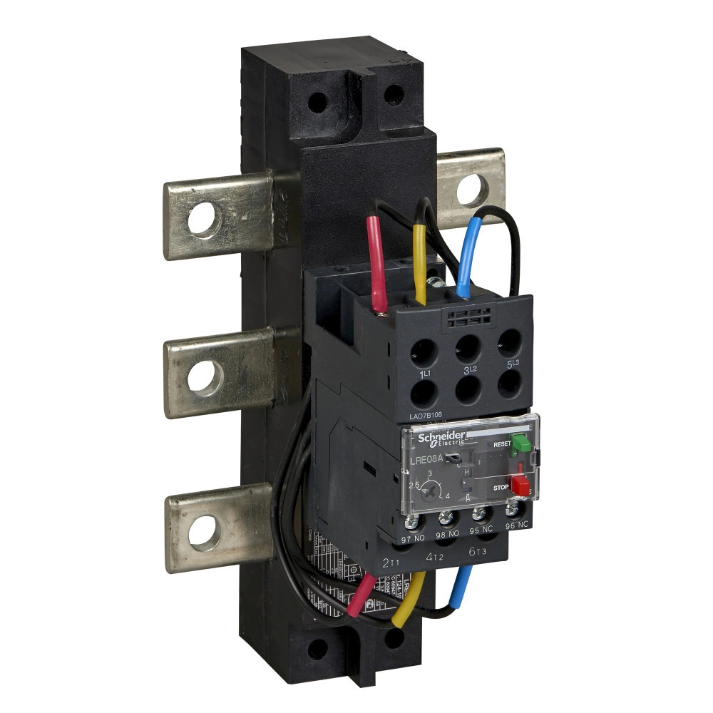 Тепловые реле перегрузки серии LRE EasyPact TVS Schneider Electric, 3Р, диапазон уставок тока (124 - 198) A, класс срабатывания 10A, номинальное напряжение до 690 В 50/60 Гц, степень защиты IP20. Реле предназначены для защиты цепей и электродвигателей от перегрузок, обрыва фазы, превышения длительности пуска и заклинивания ротора. Реле LRE применяются совместно с контакторами серии LC1E. Реле поставляются с переключателем режимов, защищенным крышкой, в положении ручного возврата.