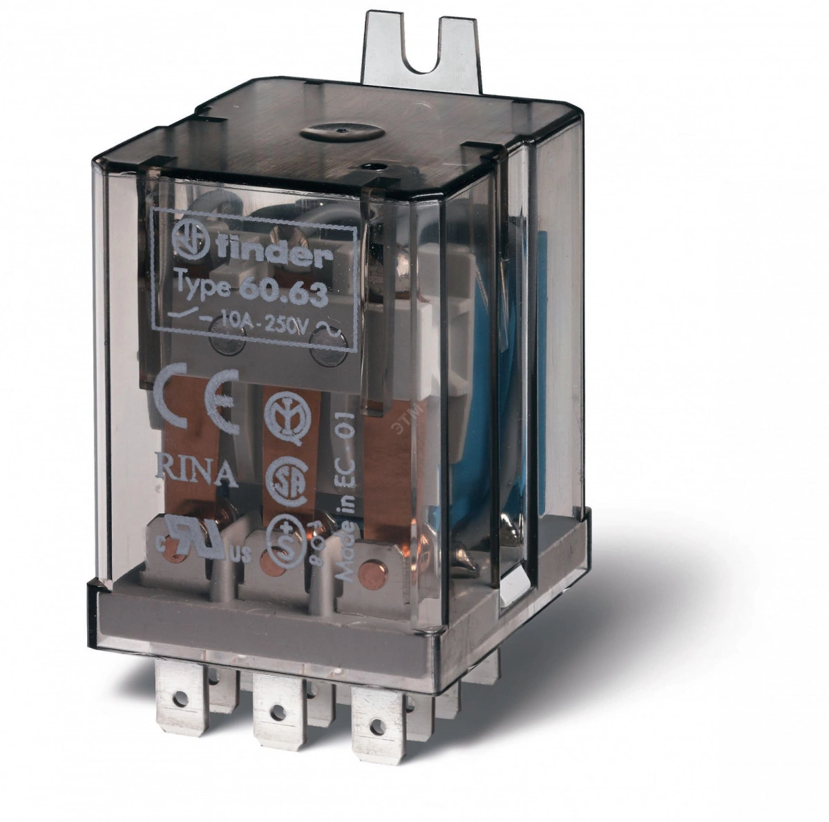 Реле универсальное электромеханическое, монтаж в наконечники Faston 187 (4.8х0.8мм), 3CO 10A, контакты AgNi, катушка 24В AC, степень защиты RTI, боковой монтажный фланец, опции: нет