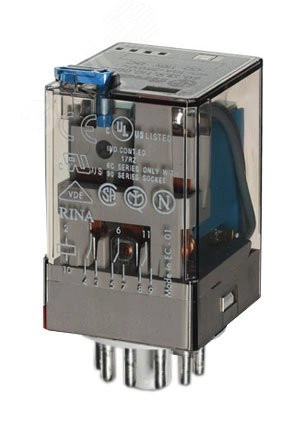 Реле универсальное электромеханическое, монтаж в розетку 11-штырьковый разъем, 3CO 10A, контакты AgNi+Au, катушка 230В AC, степень защиты RTI, опции: кнопка тест + LED