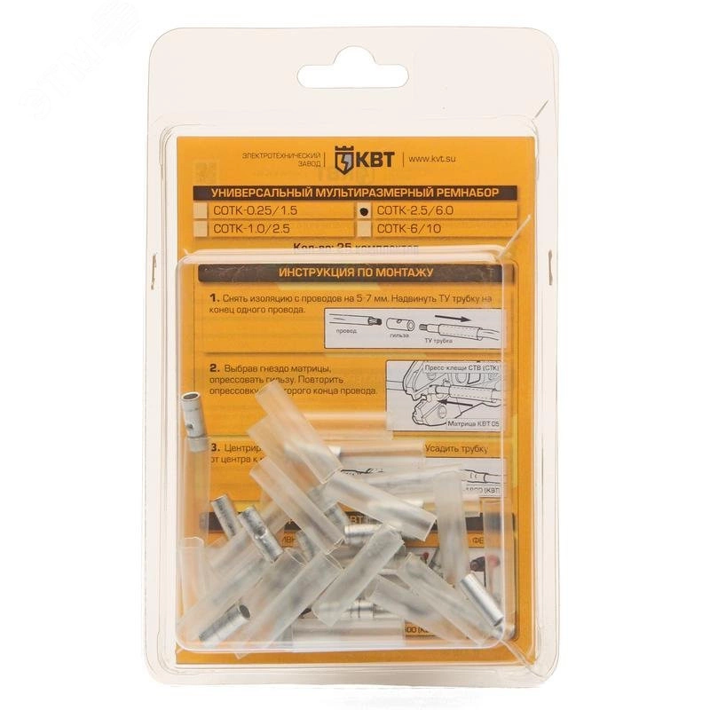 Предназначены для герметичного соединения медных проводов. Каждый комплект состоит из гильзы под опрессовку и прозрачной термоусаживаемой манжеты с клеевым слоем. Комплекты являются мультиразмерными и рассчитаны на расширенный диапазон сечений медных проводов. Материал трубок - полиолефин. Материал коннекторов - медь марки М1. Покрытие коннекторов - олово-висмутовое лужение. По центру гильз расположена стопорная перегородка, определяющая длину снятия изоляции и глубину захода медных жил. Термоусадочная трубка усаживается поверх опрессованного соединения. Термоусадочные трубки с клеевым слоем и коэффициентом усадки 3 -1 обеспечивают полную герметизацию и изоляцию соединений. Прозрачные трубки гарантируют правильное центрирование термоусаживаемой манжеты относительно гильзы и полный визуальный контроль контактных соединений после усадки