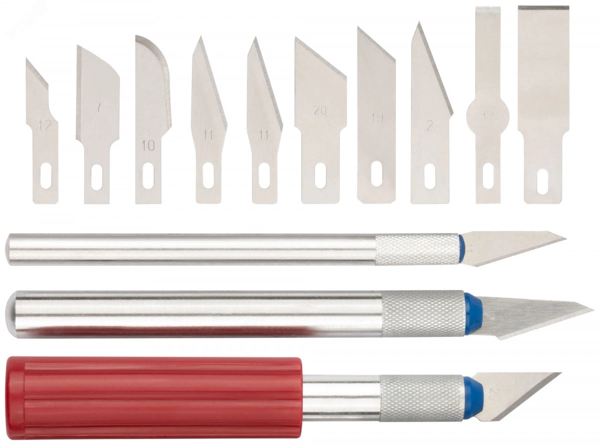 Острозаточенные лезвия способствуют высокой эффективности в работе|Закалка рабочих частей повышает твердость и износостойкость|10 сменных лезвий различных форм позволяют выполнить широкий спектр операций|Эргономичные ручки обеспечивают надежный хват