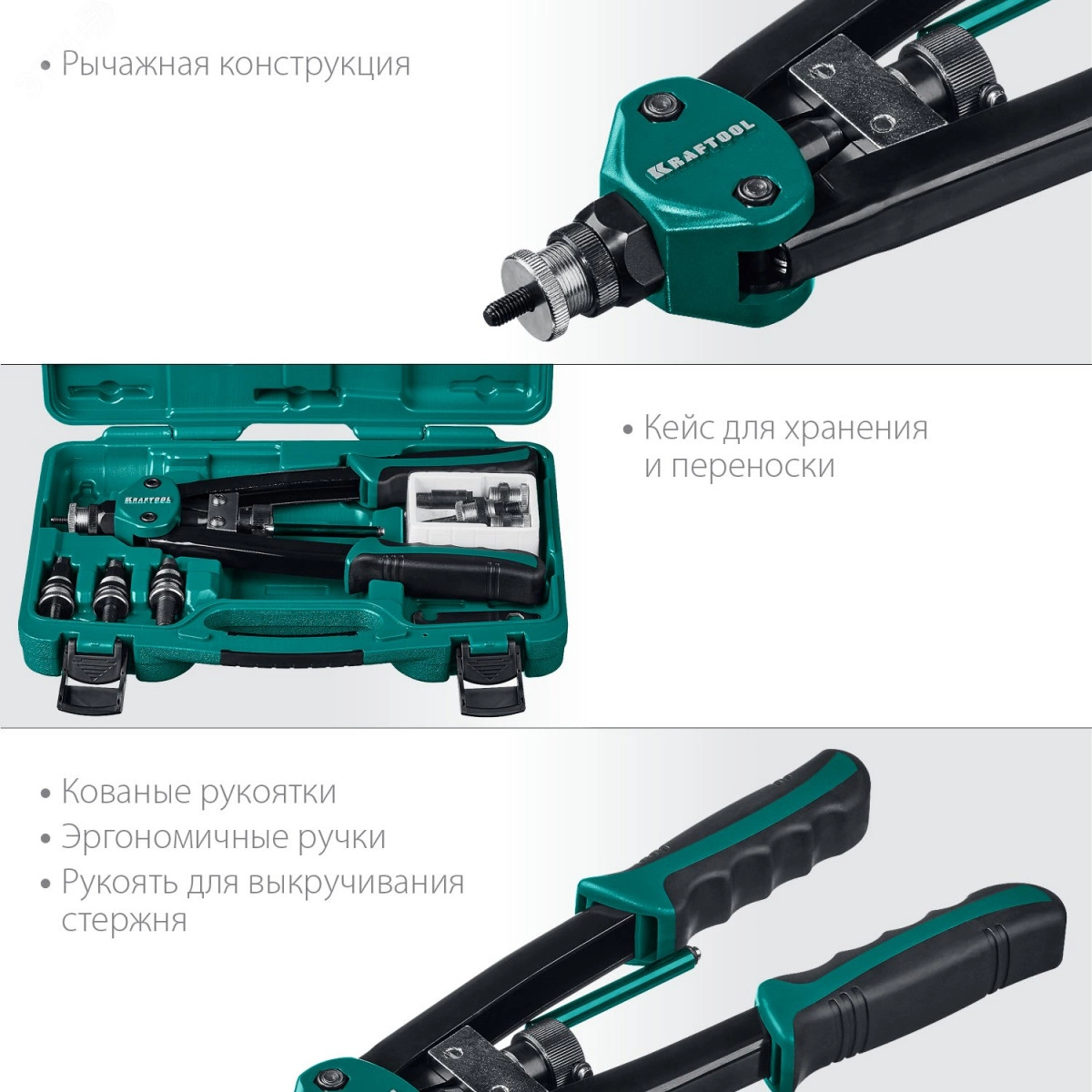 Двуручный резьбовой заклепочник KRAFTOOL выдерживает высокие рабочие нагрузки и предназначен для установки резьбовых заклепок из алюминия, стали и нержавеющей стали.