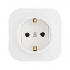 Изготовлен из пластика, квадратной формы, со стороной, равной 65 мм, белого цвета. Предусмотрены защитные шторки, автоматически закрывающие гнезда розетки при вынутой вилке.