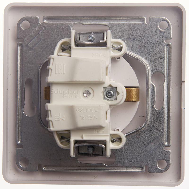 Розетка Schneider Electric Glossa (в сборе, цвет белый) одинарная с заземлением, шторками и крышкой подходит для сетей 250 В, на ток 16 А.