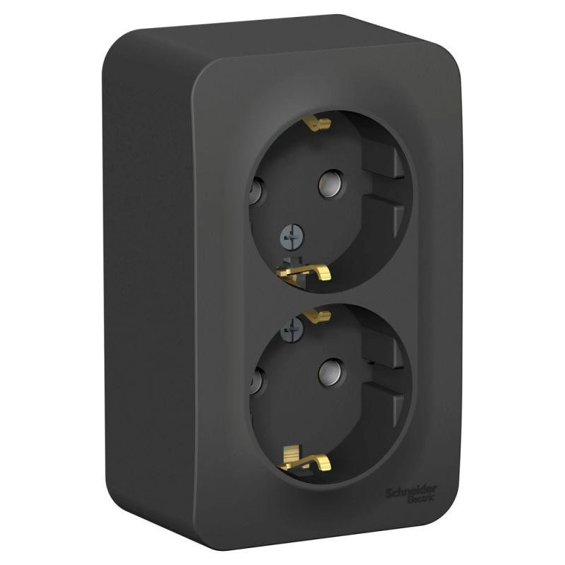 Розетка Schneider Electric BLANCA (антрацит, открытой установки) двухместная, без шторок, с заземлением и изолирующей пластиной предназначена для сетей до 250В, на ток до 16А. Двухместная розетка позволяет подключить два устройства в одном месте. Заземление обеспечивает безопасность при косвенном прикосновении. Она изготовлена из ABS-пластика, проста в установке и удобна в применении.